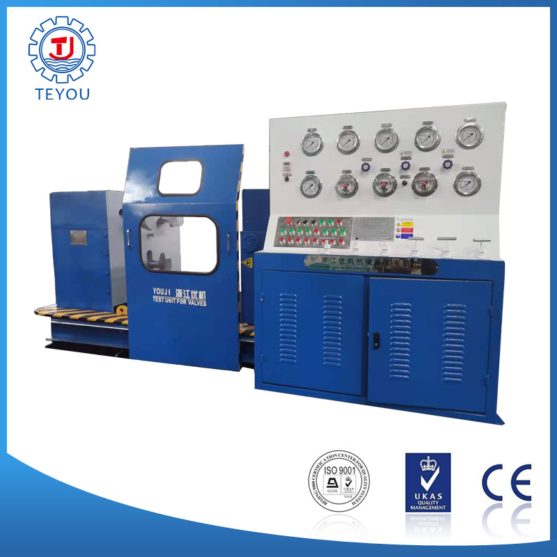 該系列控制閥壓力試驗設(shè)備主要由液壓系統(tǒng)、機械系統(tǒng)、電氣系統(tǒng)和管路系統(tǒng)組成,能在較大的控制閥公稱尺寸范圍和較大的公稱壓力范圍內(nèi),在控制閥閥體不受任何附加外力的情況下,分別對控制閥進行殼體和密封試驗。