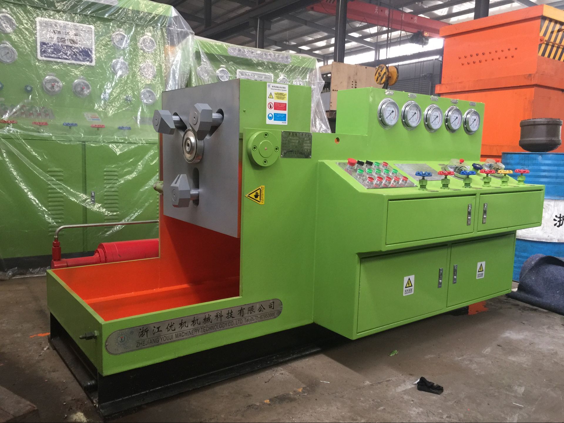 壓爪夾緊力所需的高壓液壓力,由設(shè)備本身的液壓系統(tǒng)增壓而成,試驗介質(zhì)可采用水、煤油或空氣。液態(tài)介質(zhì)可循環(huán)使用。試驗介質(zhì)的試驗壓力經(jīng)增壓達到設(shè)定的試驗壓力時,增壓自動停止,并自動進入設(shè)定的保壓計時,保壓計時結(jié)束后,系統(tǒng)自動發(fā)出聲光報警,以示測試結(jié)束。