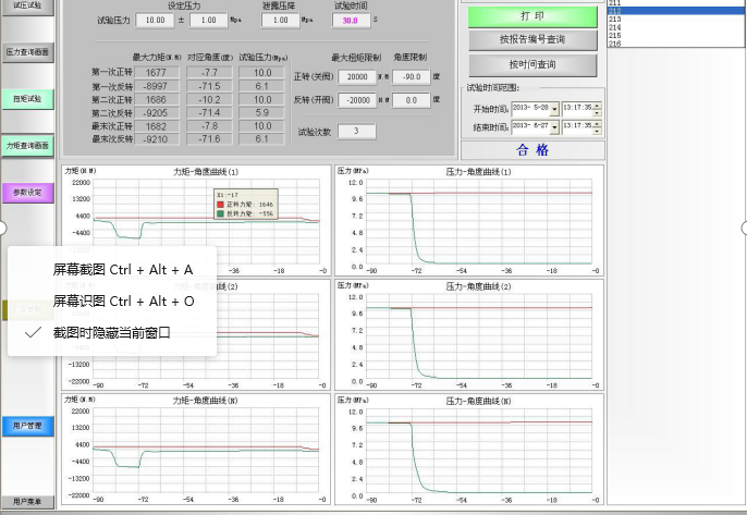 3、在進(jìn)行閥門”啟閉扭矩測試”時,該裝置以液壓能為動力,液壓馬達(dá)產(chǎn)生可控可調(diào)的扭矩,通過扭矩傳感器和萬向節(jié)傳動桿,將扭矩傳至被測閥門,在被測閥門帶壓關(guān)閉或帶壓開啟時,啟閉閥門的扭矩由扭矩傳感器檢出信號,傳至“觸摸屏監(jiān)測系統(tǒng)”,系統(tǒng)實(shí)時地將檢測全過程的扭矩值,以曲線的形式,顯示和儲存在系統(tǒng)中,同時在系統(tǒng)中顯示最大的扭矩力,通過關(guān)鍵字,可檢索、查閱和打印扭矩檢測的數(shù)據(jù)和曲線。